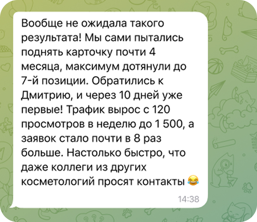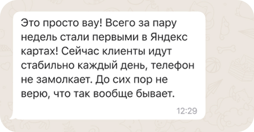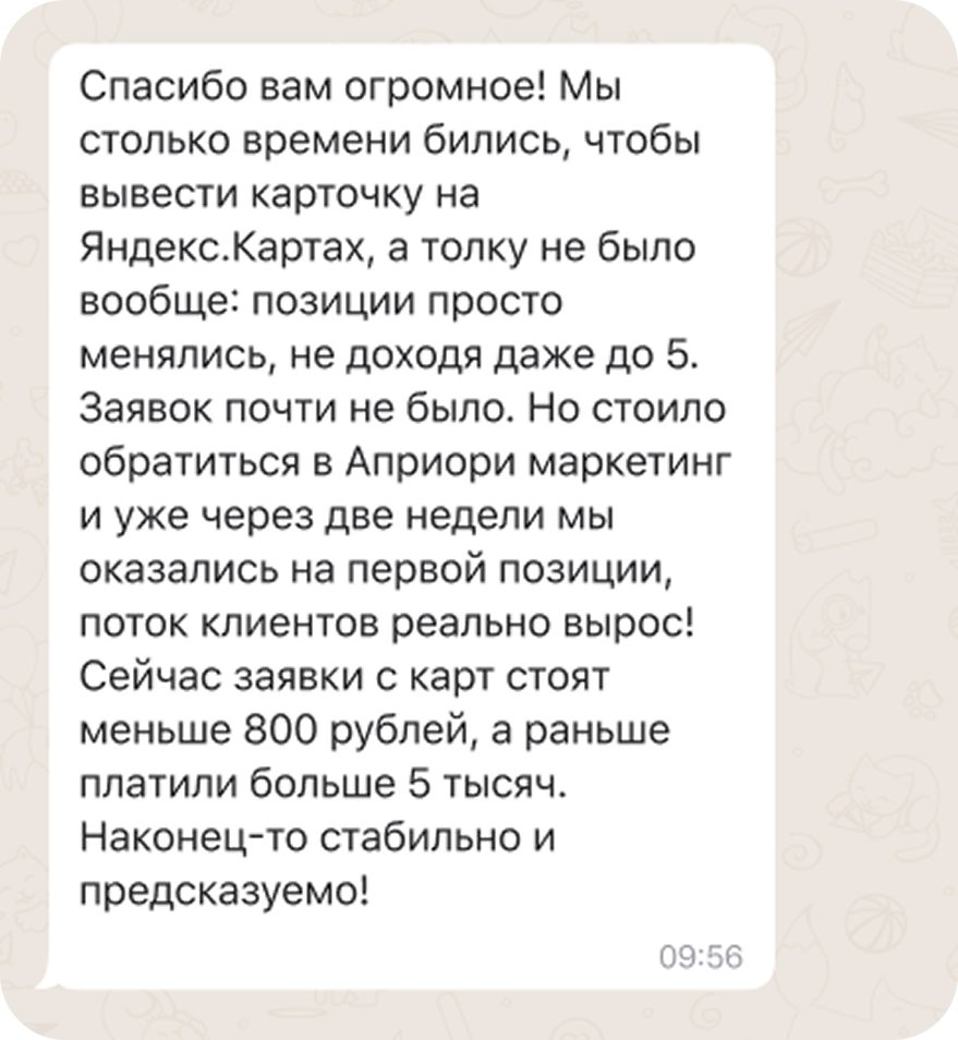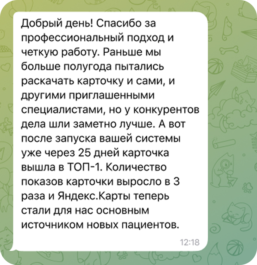 Внедрить систему, которая работает. Получить «Управляемую Машину Клиентов», которая приносит стабильный поток пациентов с Яндекс.Карт по цене в 5–10 раз ниже, чем из Директа.