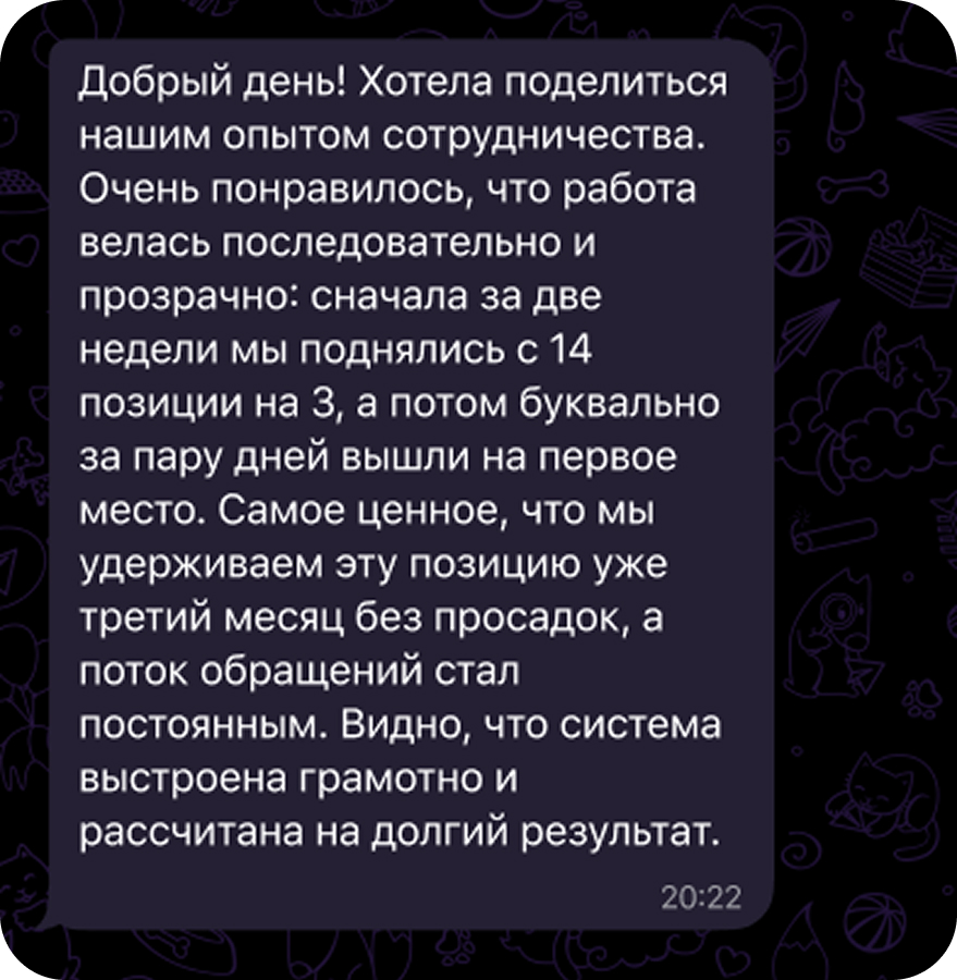 Это и есть наш Поведенческий Ускоритель™ — собственная разработка, которая выводит клиентов в ТОП-1 за 7-30 дней без рекламных бюджетов.